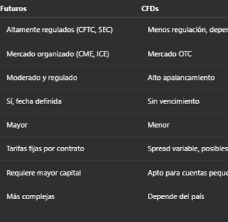 Conclusión Tanto los futuros como los CFDs son herramientas potentes para el trading, pero cada uno tiene sus propios niveles de riesgo, regulación y utilidad. Conocer sus diferencias es fundamental antes de operar. Si eres un trader latino en búsqueda de crecimiento y formación profesional, define tu perfil, establece objetivos claros y prioriza siempre la gestión del riesgo, la educación continua y el uso de plataformas confiables.